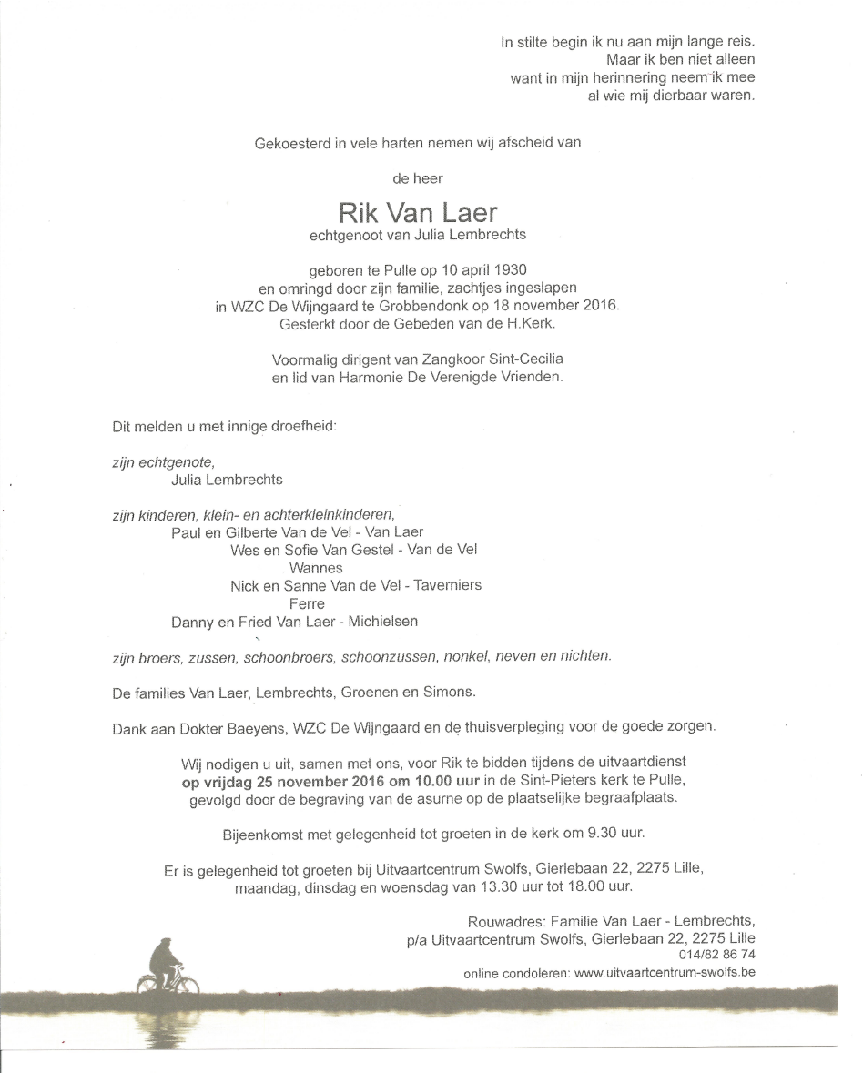 Overleden te Grobbendonk (2280) op vrijdag 18 november 2016 op 86-jarige leeftijd