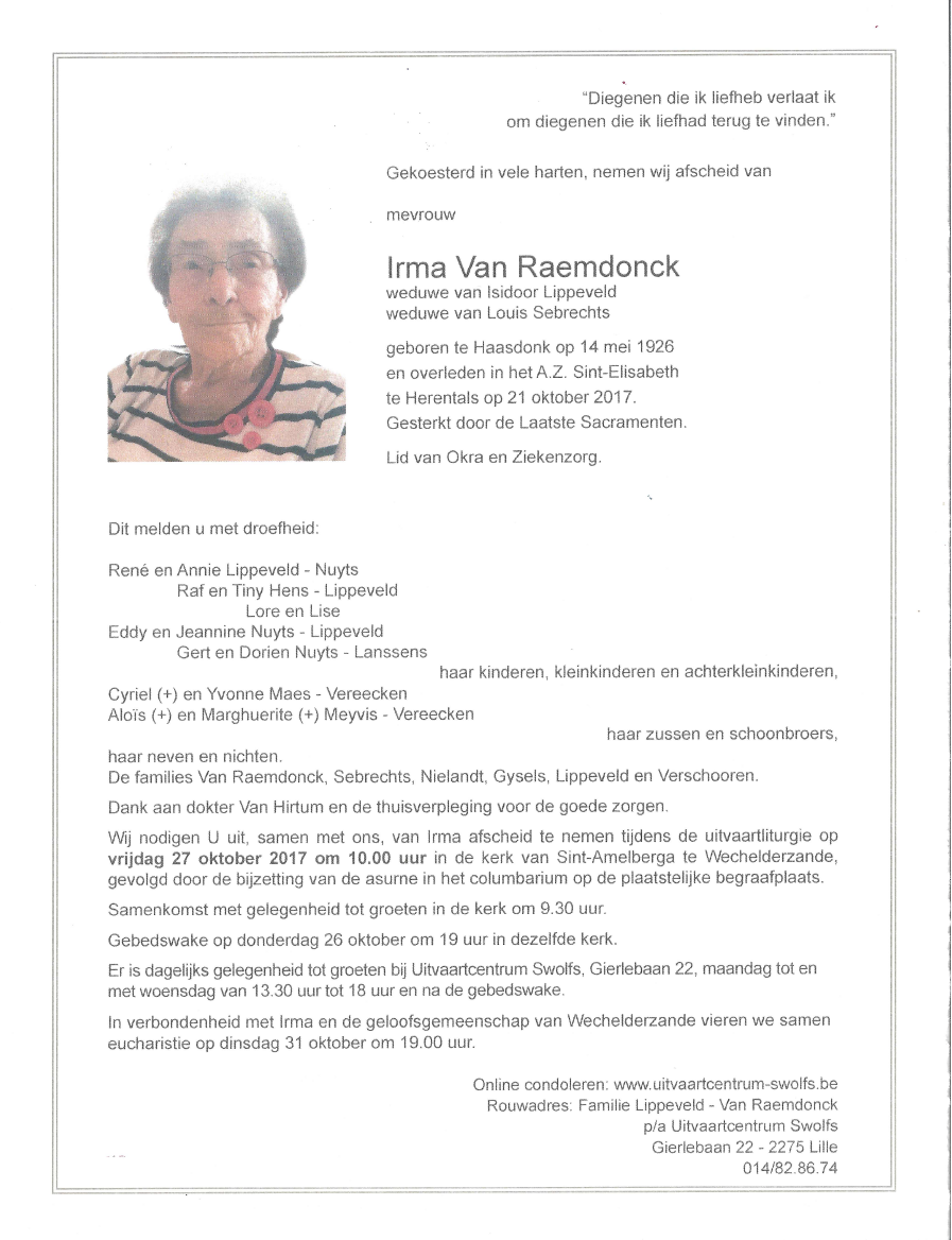 Overleden te Herentals (2200) op zaterdag 21 oktober 2017 op 91-jarige leeftijd
