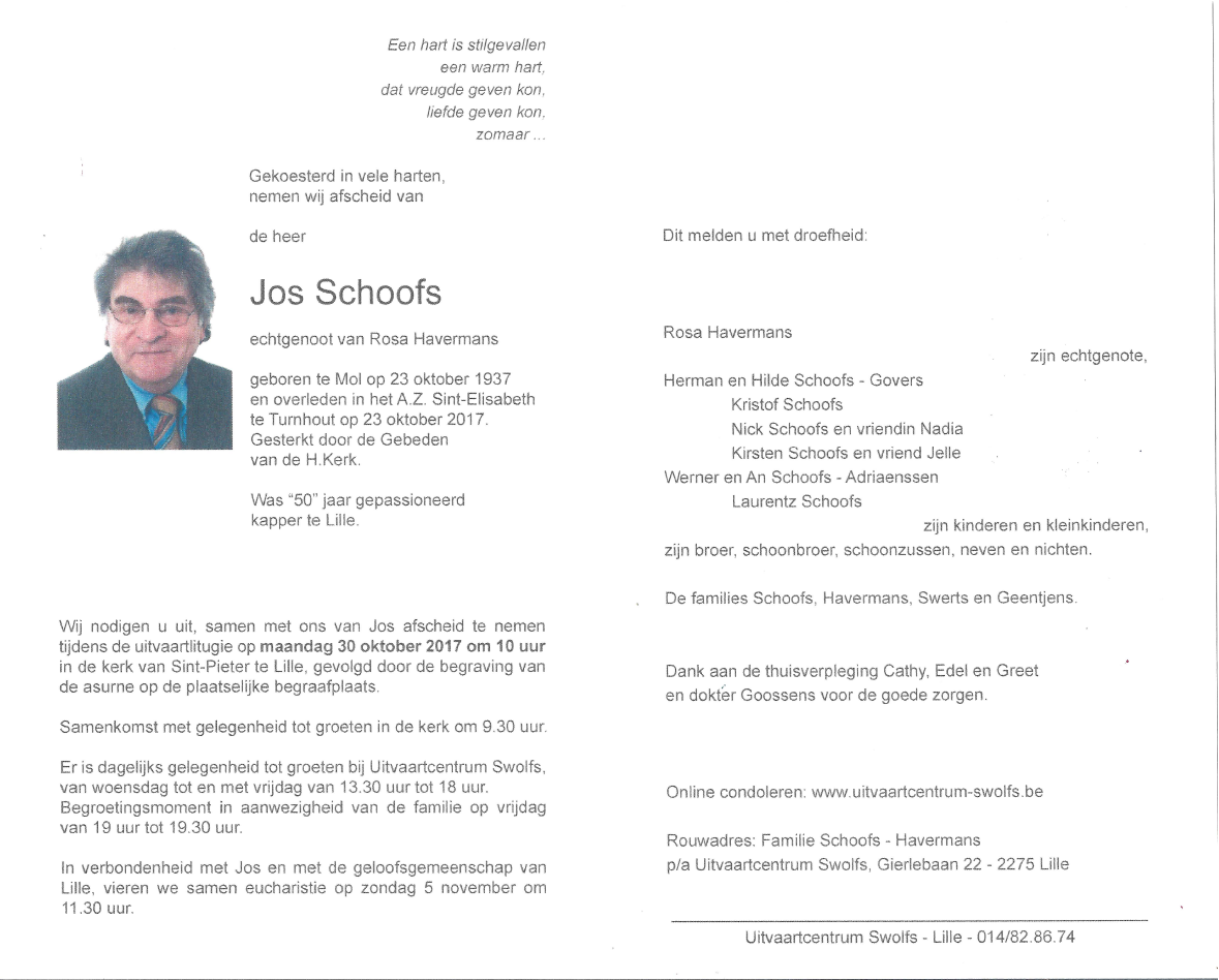 Overleden te Turnhout (2300) op maandag 23 oktober 2017 op 80-jarige leeftijd