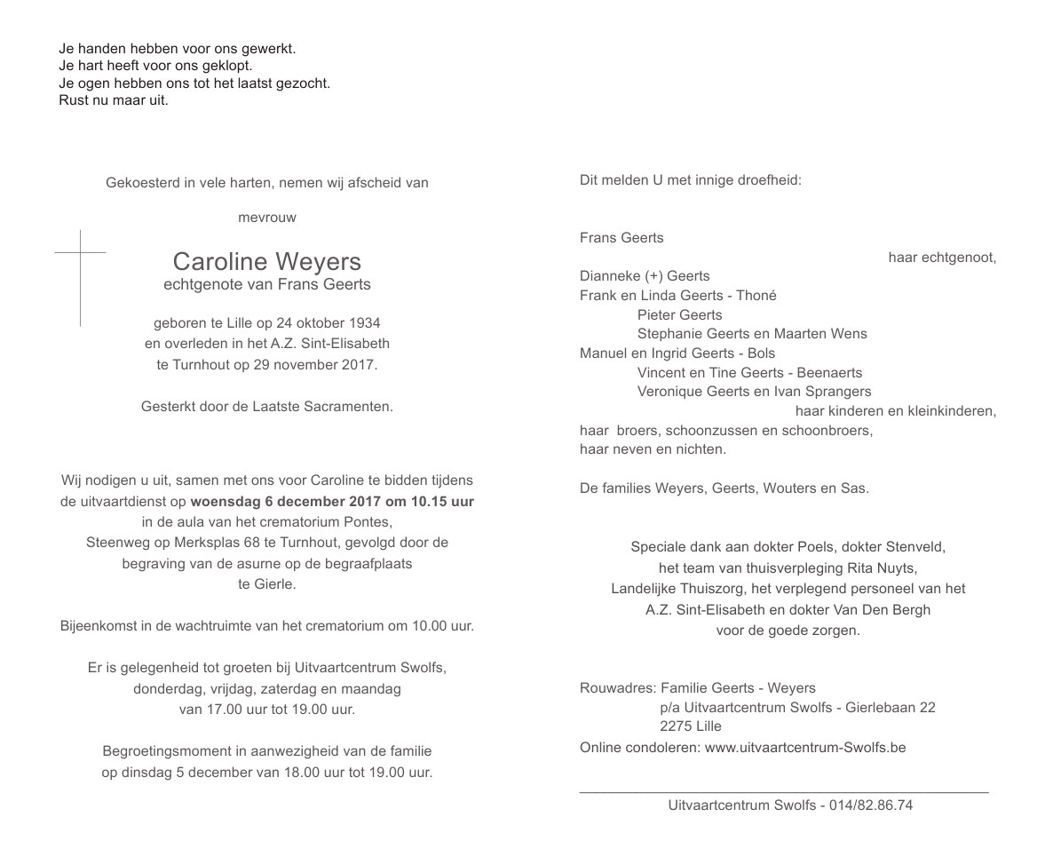 Overleden te Turnhout (2300) op woensdag 29 november 2017 op 83-jarige leeftijd