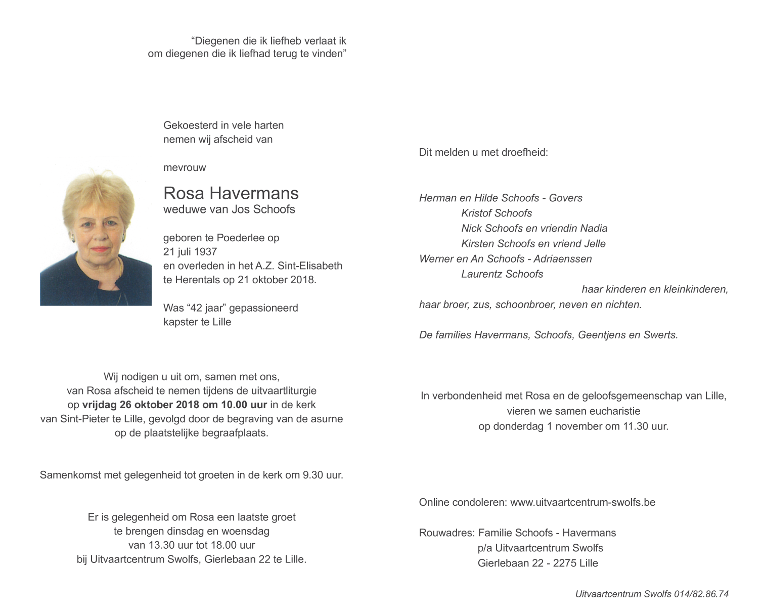 Overleden te Herentals (2200) op zondag 21 oktober 2018 op 81-jarige leeftijd