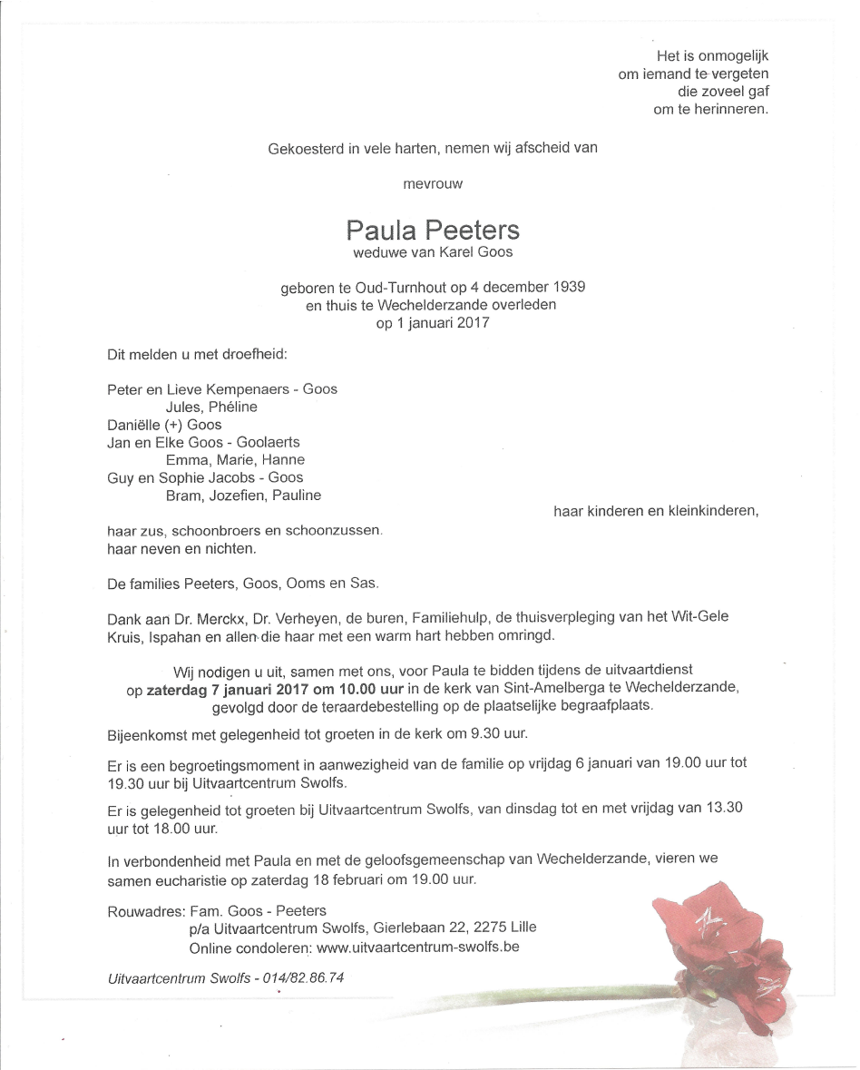 Overleden te Wechelderzande (2275) op zondag 1 januari 2017 op 77-jarige leeftijd