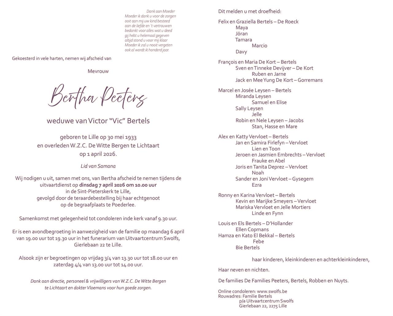Overleden te Lichtaart (2460) op woensdag 1 april 2026 op 92-jarige leeftijd