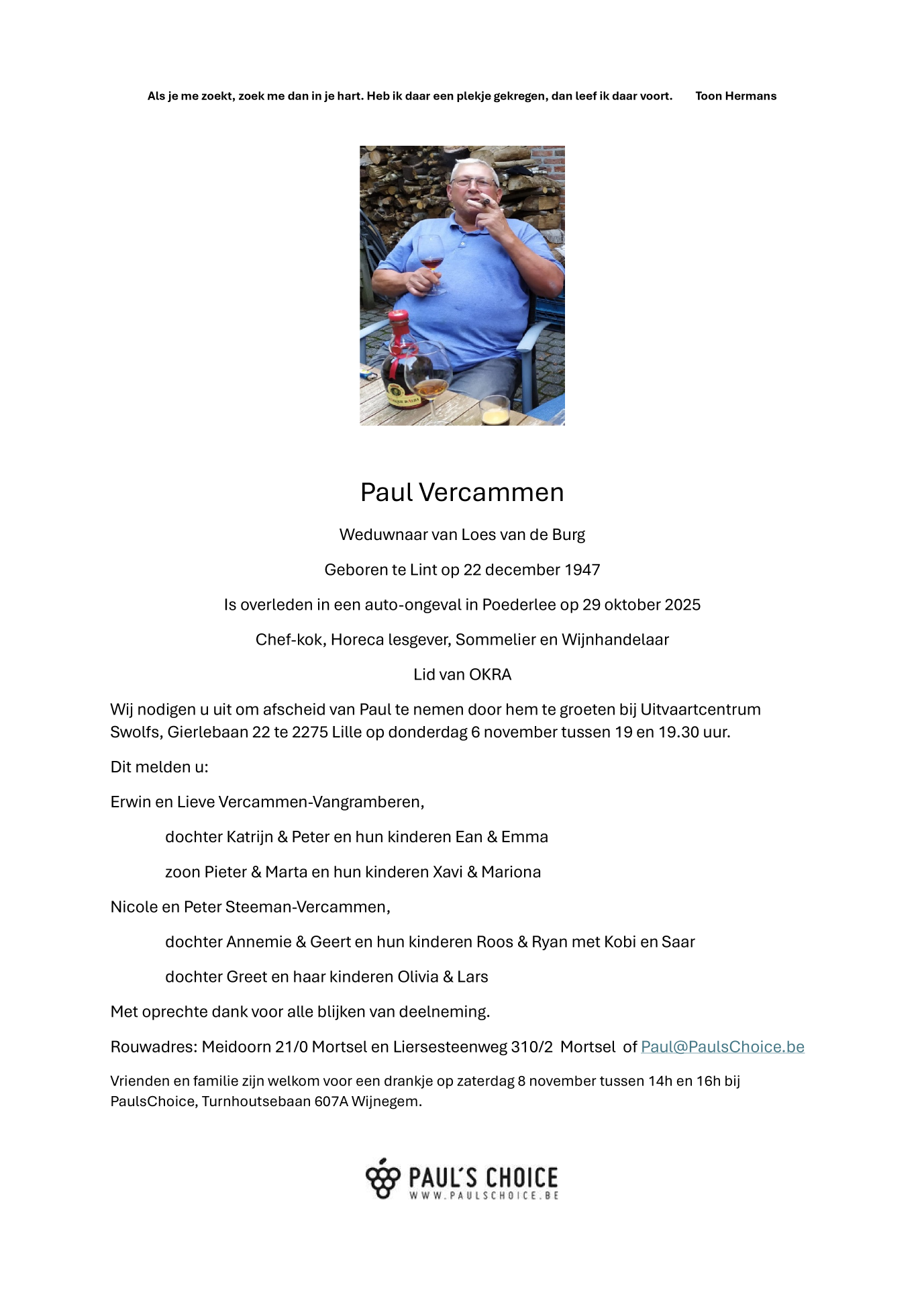 Overleden te Poederlee (2275) op woensdag 29 oktober 2025 op 77-jarige leeftijd