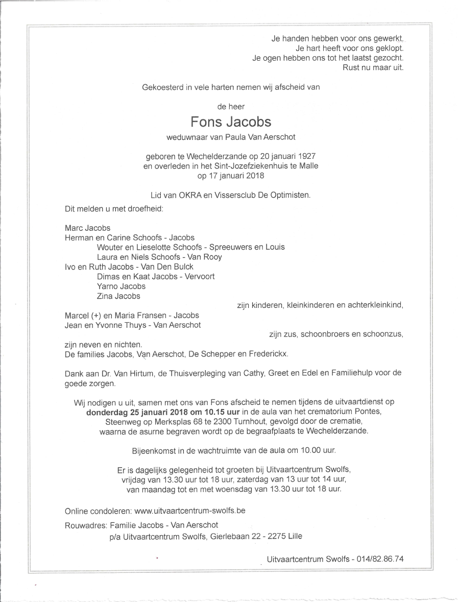 Overleden te Malle (2390) op woensdag 17 januari 2018 op 90-jarige leeftijd