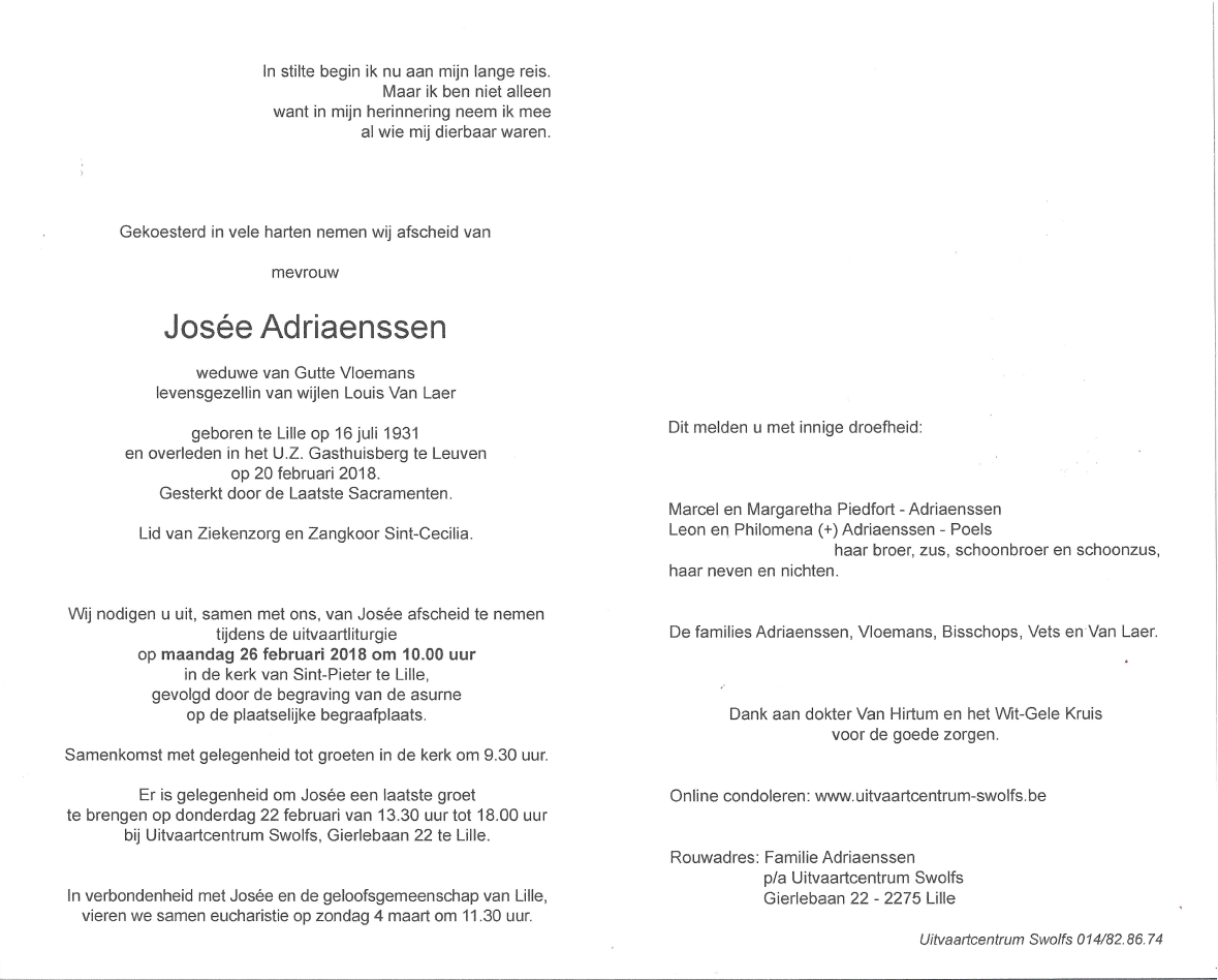 Overleden te Leuven (3000) op dinsdag 20 februari 2018 op 86-jarige leeftijd