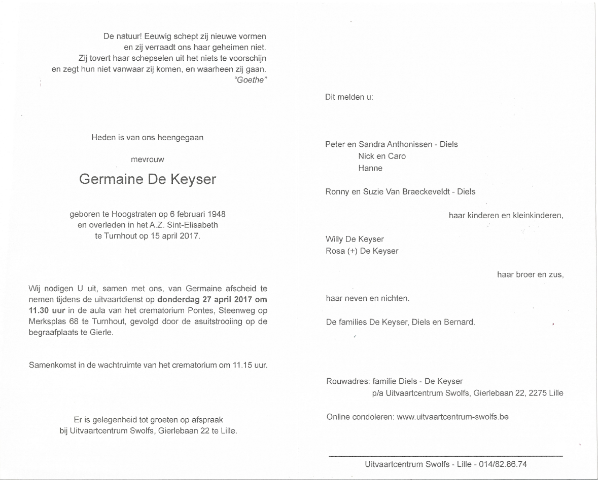 Overleden te Turnhout (2300) op zaterdag 15 april 2017 op 69-jarige leeftijd